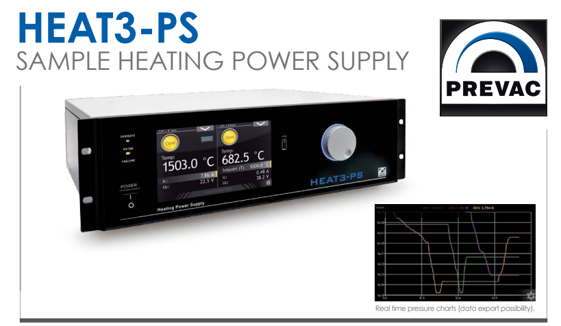 The HEAT3-PS is used for resistive heating or electron bombardment heating. The power supply can also be used for effusion cell evaporators. The unit is equipped with a PID temperature control