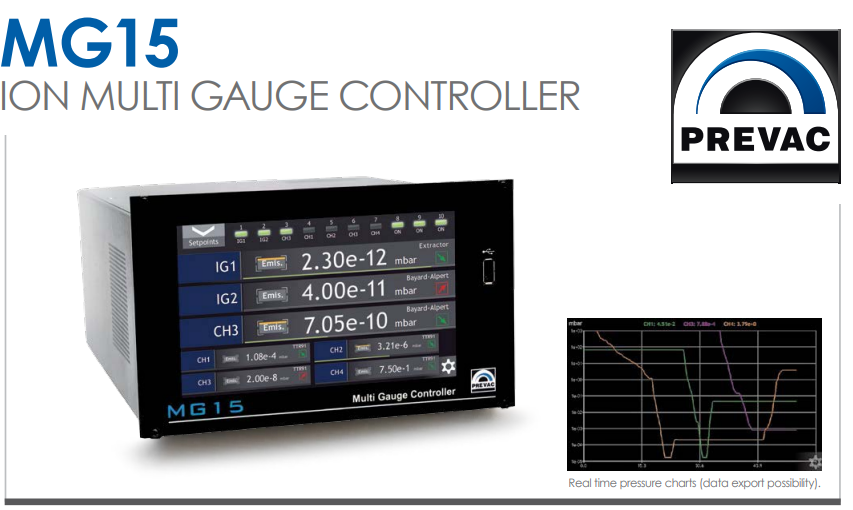 The MG15 is able to support four active gauges and up to three passive gauges, extending the measurement range to 2×10-12 mbar. The unit is fully software controlled.